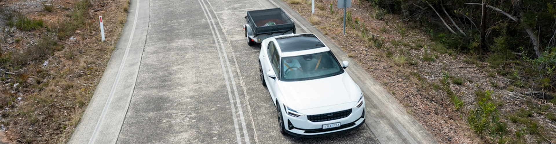 To experience EV towing firsthand, we nabbed the new Polestar 2 long range dual motor, which has a tow rating of 1500kg braked and 750kg unbraked. We then sourced an unbraked single-axle box trailer with 213cm x 152cm dimensions. It’s a common type that sits in many suburban driveways and is often a courtesy trailer available at large DIY or garden outlets.