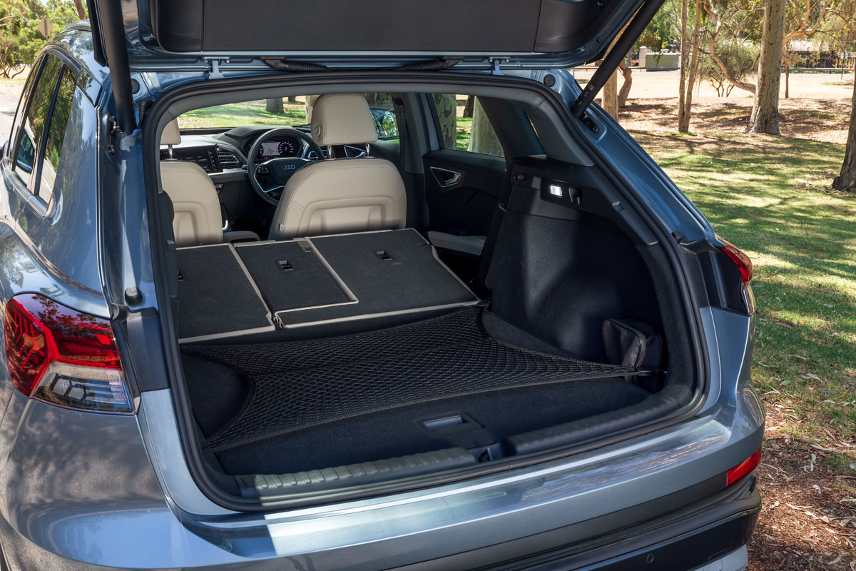 Meanwhile, the Q4 e-tron’s boot space (520L-535L depending on variant) offers ample space for a couple of full-size suitcases or a designer pram, together with split-fold adjustment, a luggage net and space for charging cables underneath. If anything, our biggest boot gripe is the lack of a physical spare tyre.