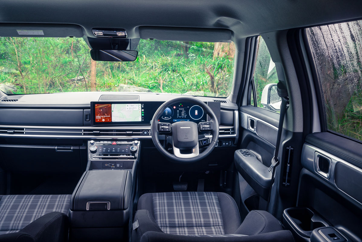 The Santa Fe sits somewhere in the middle in terms of materials and finish, with its tartan-finish seats (very VW Golf GTI-esque), curved centre screen display and the best mix of storage, including a mammoth open cubby underneath the centre console. There’s a generally durable premise to the plastics (especially those out of your line of sight), though its comfy chairs and thick-rimmed steering wheel feel anything like a base-spec car.