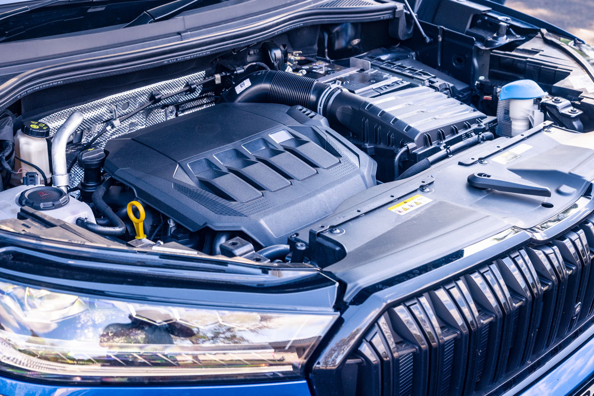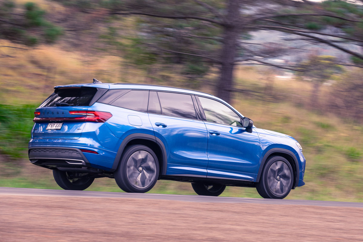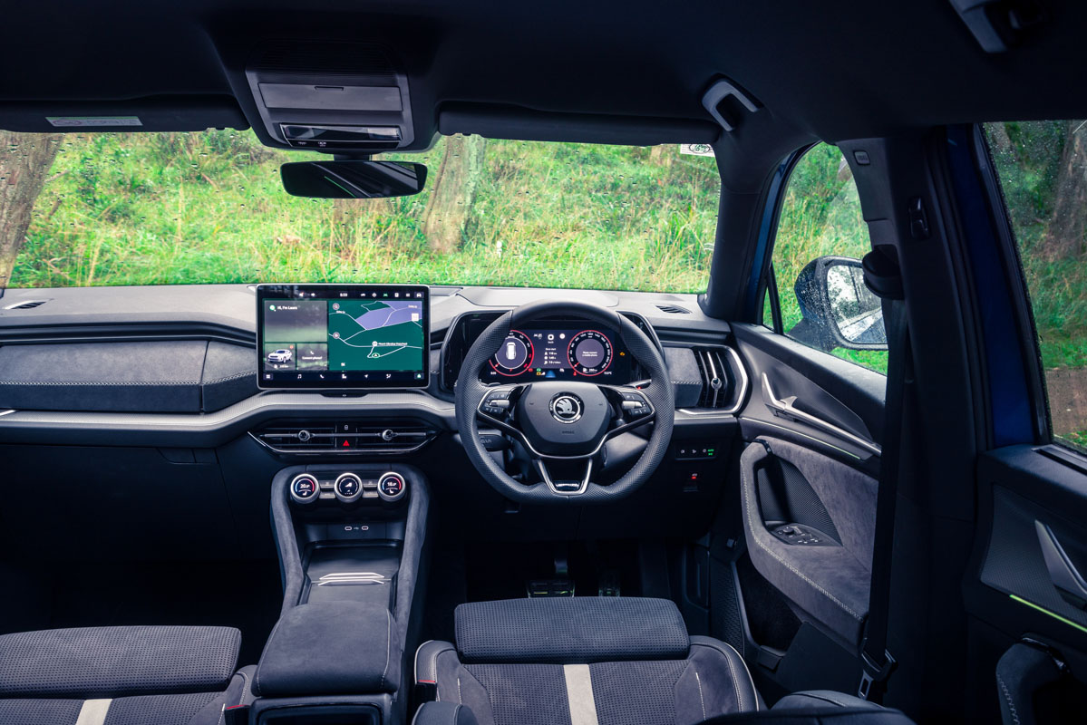 The Skoda immediately imparts a sense of athleticism and lightness in our company of three, with well-weighted steering, deft control through corners, and meaningful tuning of its key controls. The 2.0-litre turbo-petrol is prone to some hesitation upon take-off – a symptom of the dual-clutch auto and some turbo lag – but percolates confidently thereafter, slicing through its seven ratios. The four-cylinder occasionally feels languid in the mid-range, however, struggling to shift the Kodiaq’s 1900kg kerb with enthusiasm – and that’s with a solitary person on board, not a family and their luggage.