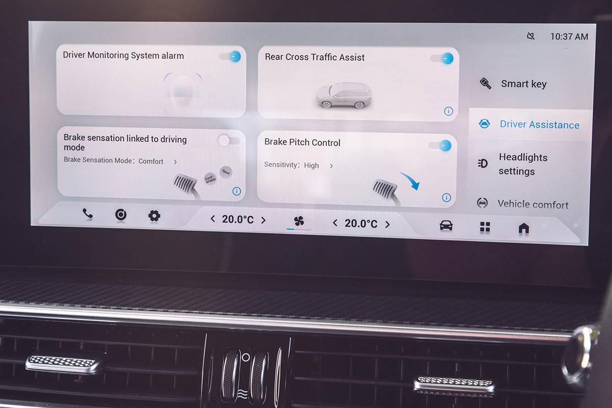 The centre touchscreen provides good response, brightness and clarity; however, its operating system is not among the most intuitive we’ve experienced. Simple adjustments often require a dive and scroll through multiple subheads, and naming conventions will require users to develop some familiarity.