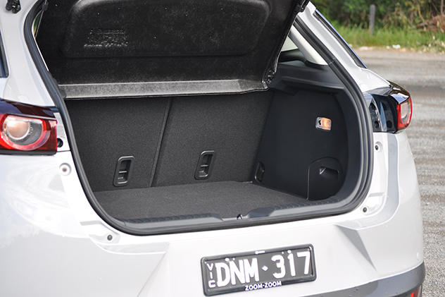 Mazda’s vehicles generally aren’t renowned for their cargo space, either, and the CX-3’s boot offers just 264 litres, which means it’s maxed out at a large suitcase. That said, it has a useful 1000mm width and if the second row is folded down it creates a handy 1174 litre load space. Under the boot floor resides a space saver spare wheels.