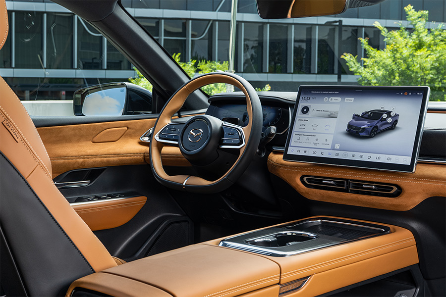 Much like its handsome exterior, the Mazda 6e’s cabin makes a strong first impression. Our test car is a high-spec variant and it greets you with swathes of tan suede and soft leather as you open the door (which is frameless for a welcome touch of glamour). The detailing is impressive, too, with diamond stitching on the seats and Mazda badging on the steering wheel and headrests.