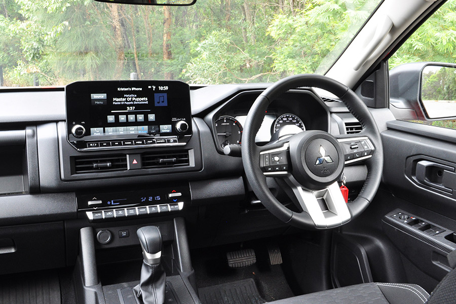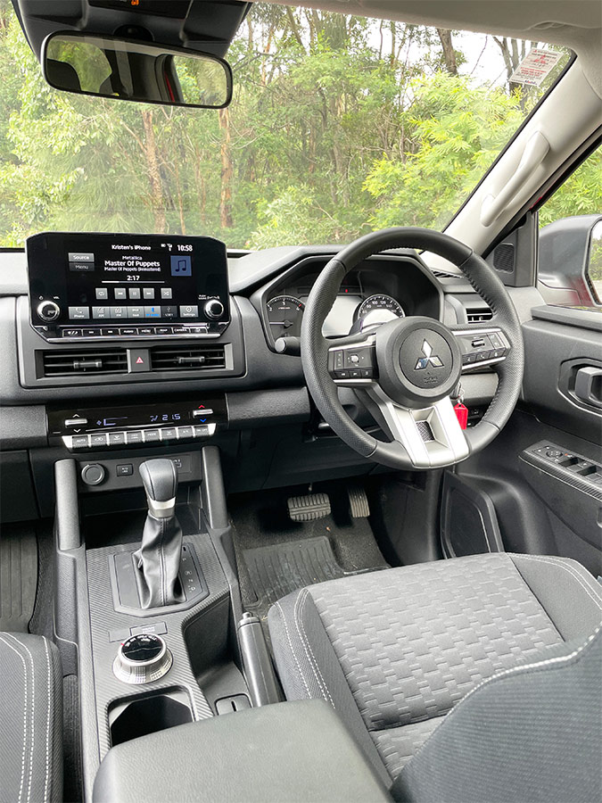 The instruments are more what you’d expect from a $50k-plus vehicle in 2025. Mitsubishi’s quality nine-inch infotainment screen sits proud on the dash for easy access and presents its various features in clear, high-resolution imagery. Between the traditional speedo and tacho is a seven-inch multi-function driver display with compass, digital speedo, current audio track, outside temperature and vehicle information. While Triton’s six-speaker audio system doesn’t boast a fancy brand name, its high-fidelity sound is a pleasant experience. Also on offer up front are climate control and a USB-A and USB-C port. A row of switches dedicated to air con temperature, fan speed and air recirculation are a welcome touch.