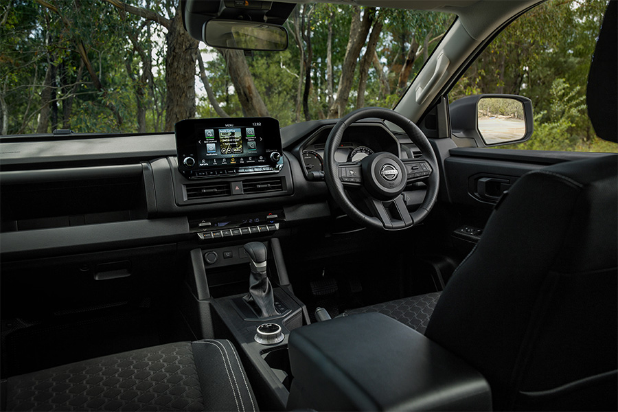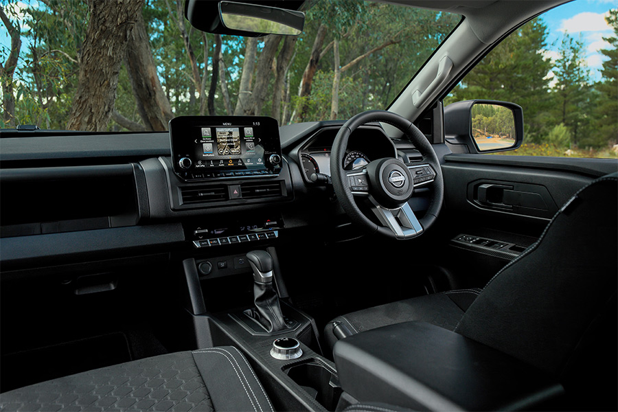 Sharing cabin DNA with the Triton is not a bad thing, though, and the new Navara adopts its strong ergonomic fundamentals, including a good balance between physical control equipment and on-screen adjustments. Cloth trim is swapped for synthetic leather as grades ascend, with real leather accenting on steering wheels for ST and up, with a leather shift boot on ST-X and up.