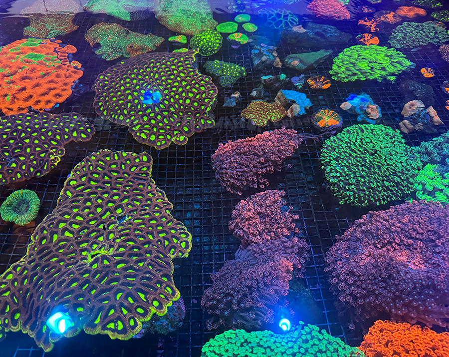 Monsoon Aquatics is a working coral farm and research centre set up near the mouth of the Burnett River in Burnett Heads. On hot and humid days, the tour guide offers visitors a fan, as the coral farms are situated in stuffy sheds.
