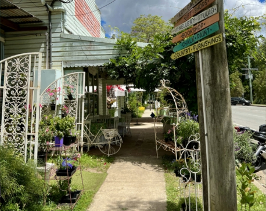 Tyalgum is in the heart of Wollumbin-Mount Warning’s green caldera. At its centre is Flutterbies Cottage Cafe set in a restored bakery and butchery. With its dappled light and old-world charm, it’s like we’ve stumbled into a place where Alice in Wonderland meets The Secret Garden.