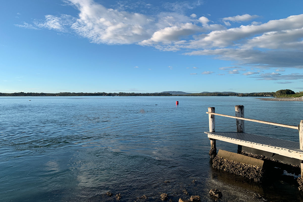 The next morning my daughter Chloe and I put Maple in a harness and set off to explore our surroundings. We follow Point Road along the Coolongolook River and, on a jetty near the bridge between Tuncurry and Forster, Chloe spots a dolphin investigating a red buoy. The river empties into the ocean just beyond the bridge and this inlet teems with fish and the creatures that eat them, including dolphins and sharks.