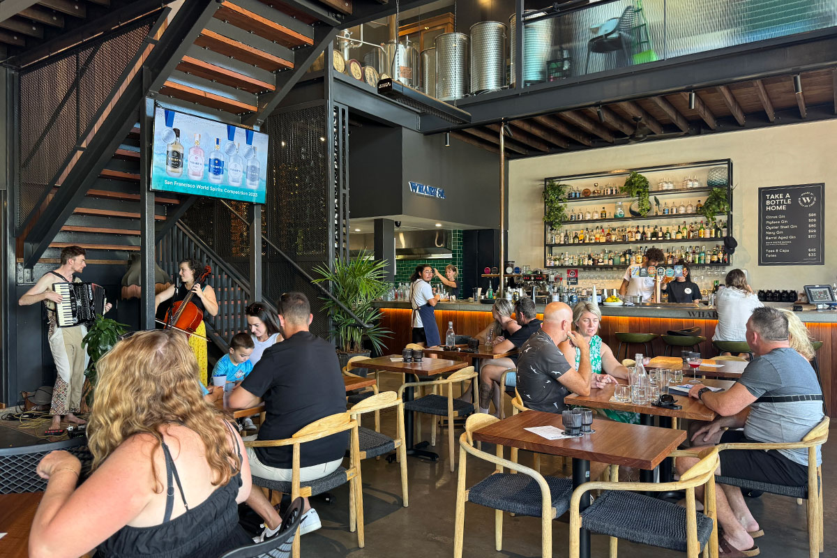 Our return to Forster’s town centre delivers us to Wharf St Distillery Restaurant where Kellie is eager to try the gin tasting palette. It’s right up her alley with fruits, ice and tonic water to mix with each gin, plus tasting notes on little cards. I’m just pleased to find Coopers lager on tap amid the trendy alcoholic ginger beer and more fruity IPAs. Wharf St has live music on Saturday afternoons and today the entertainment is Good Habits from the UK. Their jazzy folk-music stylings provide a cheery background to our afternoon tipples and they end their set with rousing renditions of ‘Bulletproof’ by La Roux and ‘Video Killed the Radio Star’ by The Buggles. Even the girl behind the bar dances along, a cocktail shaker in each hand.