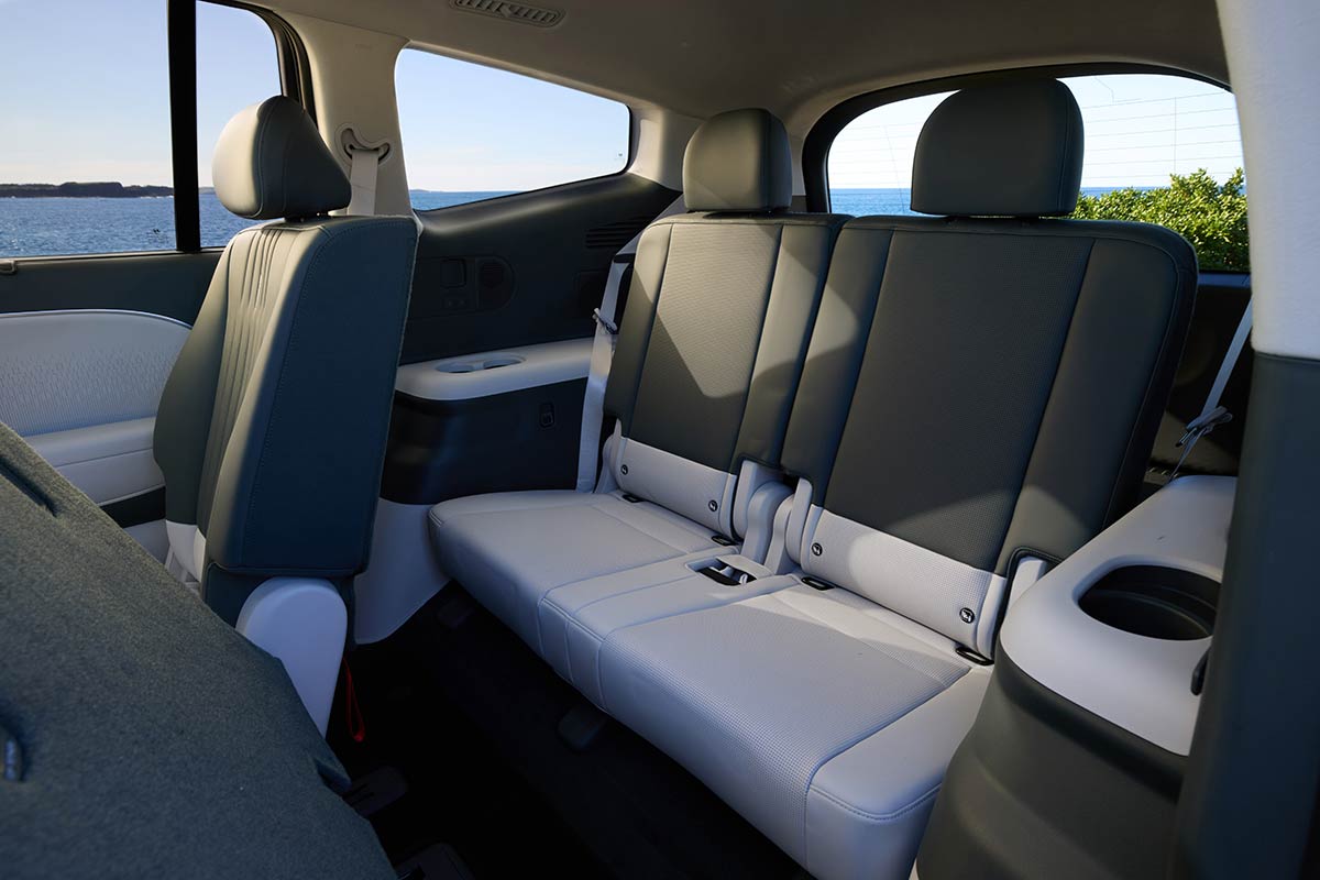 If you’re after room, the Ioniq 9 doesn’t disappoint. With a 3130mm wheelbase, it’s among the most spacious three-row EVs going. Headroom and legroom are generous in all three rows (headroom: 1005/996/1000mm; legroom: 1052/1086/813mm), and shoulder room is similarly ample.