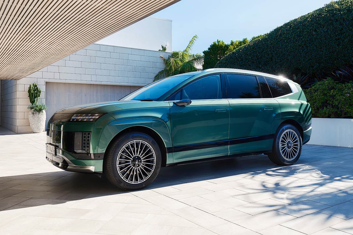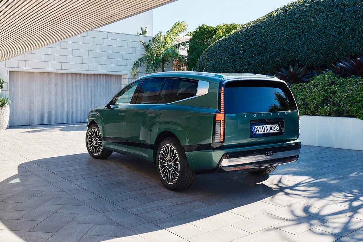 A long roofline and crisp body crease down the flanks underline a grand-SUV presence, complimented by big, machined 21-inch alloys. Sculpted wheel arches, angled D-pillar and flush, powered door handles add to the Ioniq 9’s bold flagship appeal.