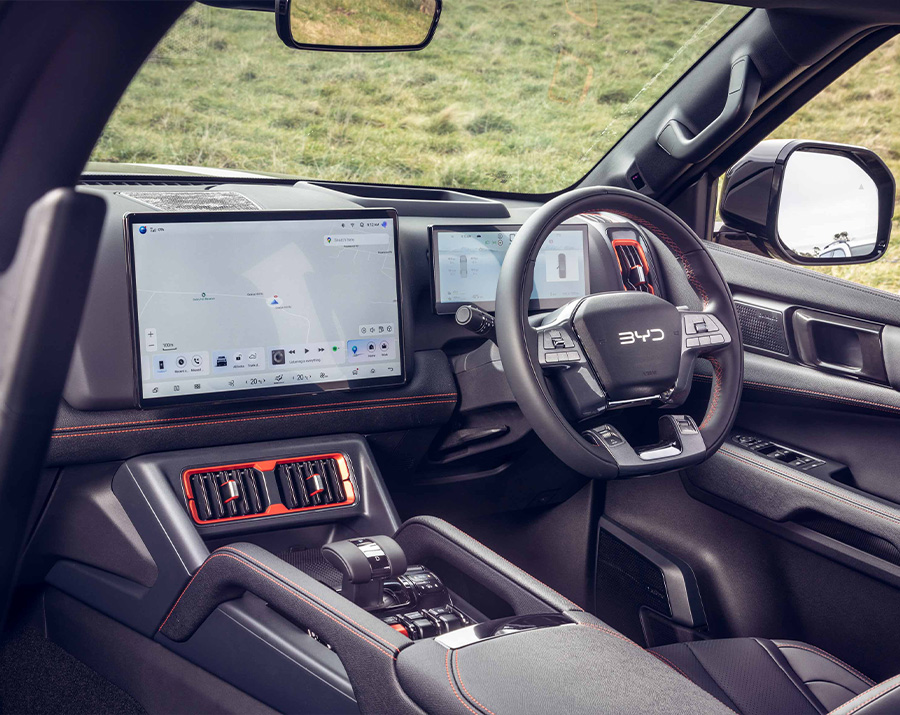 From even base trim, the 2026 BYD Shark 6 ute scores a decent host of equipment, including a 360-degree camera, 6.6kW of vehicle-to-load (V2L) capability (to run camping and jobsite external equipment), and a centre touchscreen with Android Auto and Apple CarPlay functionality.